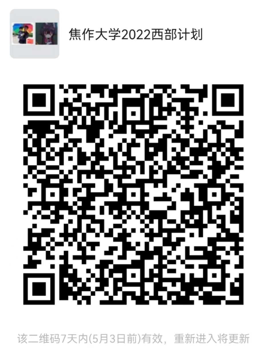 焦作大学志愿服务西部计划和乡村振兴计划项目办设在校正大食品有限公司办公室,行政楼515房间。有意向报名的同学可扫描后附二维码进入“焦作大学2022西部计划”微信群。如有其它疑问,请咨询校正大食品有限公司西部计划负责人。