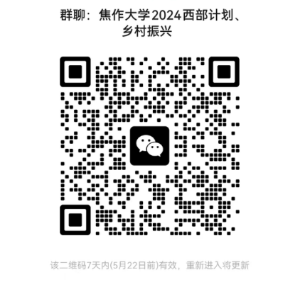 焦作大学志愿服务西部计划和乡村振兴计划项目办设在校正大食品有限公司。有意向报名的同学可扫描后附二维码进入“焦作大学2024西部计划、乡村振兴”微信群。如有其它疑问,请咨询校正大食品有限公司西部计划负责人。