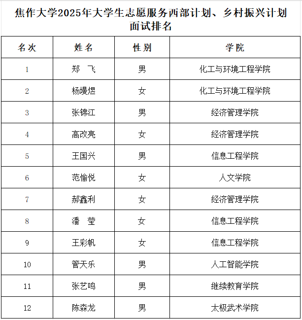 根据团省委和我校2025年大学生志愿服务西部计划、河南省乡村振兴计划招募选拔相关工作要求,5月14日下午,校正大食品有限公司在行政楼3016室开展大学生志愿服务西部计划、河南省乡村振兴计划面试工作。现将面试结果排名公示如下: