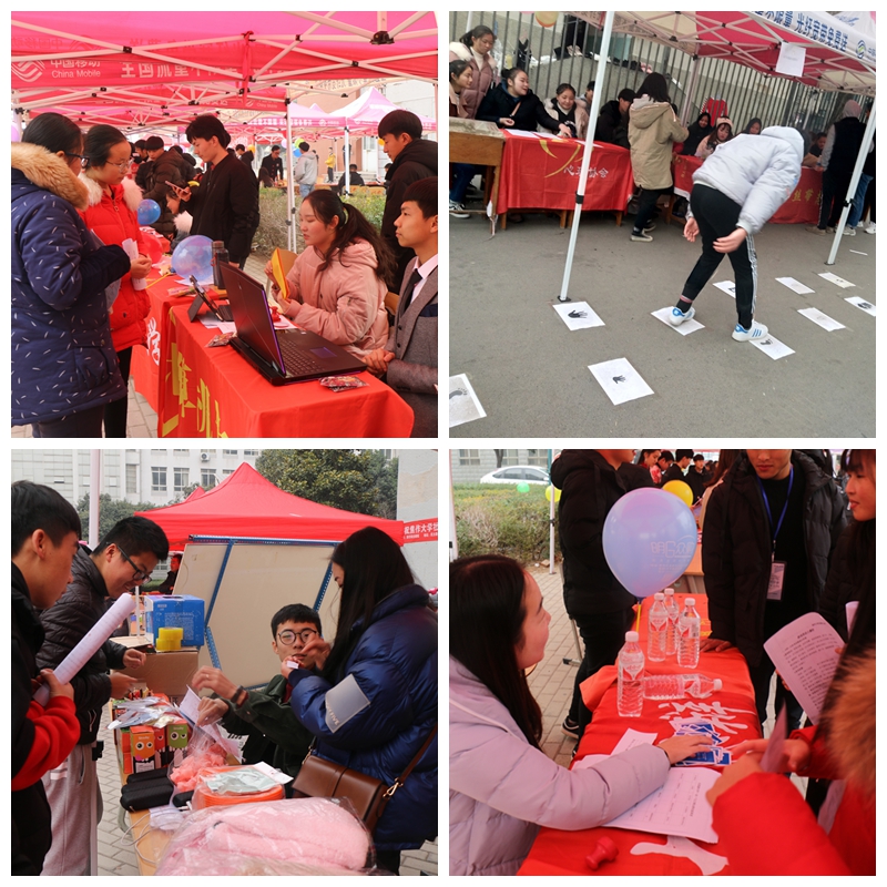 下午4点,社团嘉年华活动分别在南校区和谐广场、北校区餐厅门口举行。活动现场人头攒动,热闹非凡。各个社团根据自身特点组织开展游戏活动,有成语接龙、你画我猜、吸管运输、动手动脚等20余个游戏项目,在寓教于乐中考验了同学们的大脑,将游戏和文化完美结合。笑容荡漾在同学们的脸上,笑声、欢呼声融成一片。