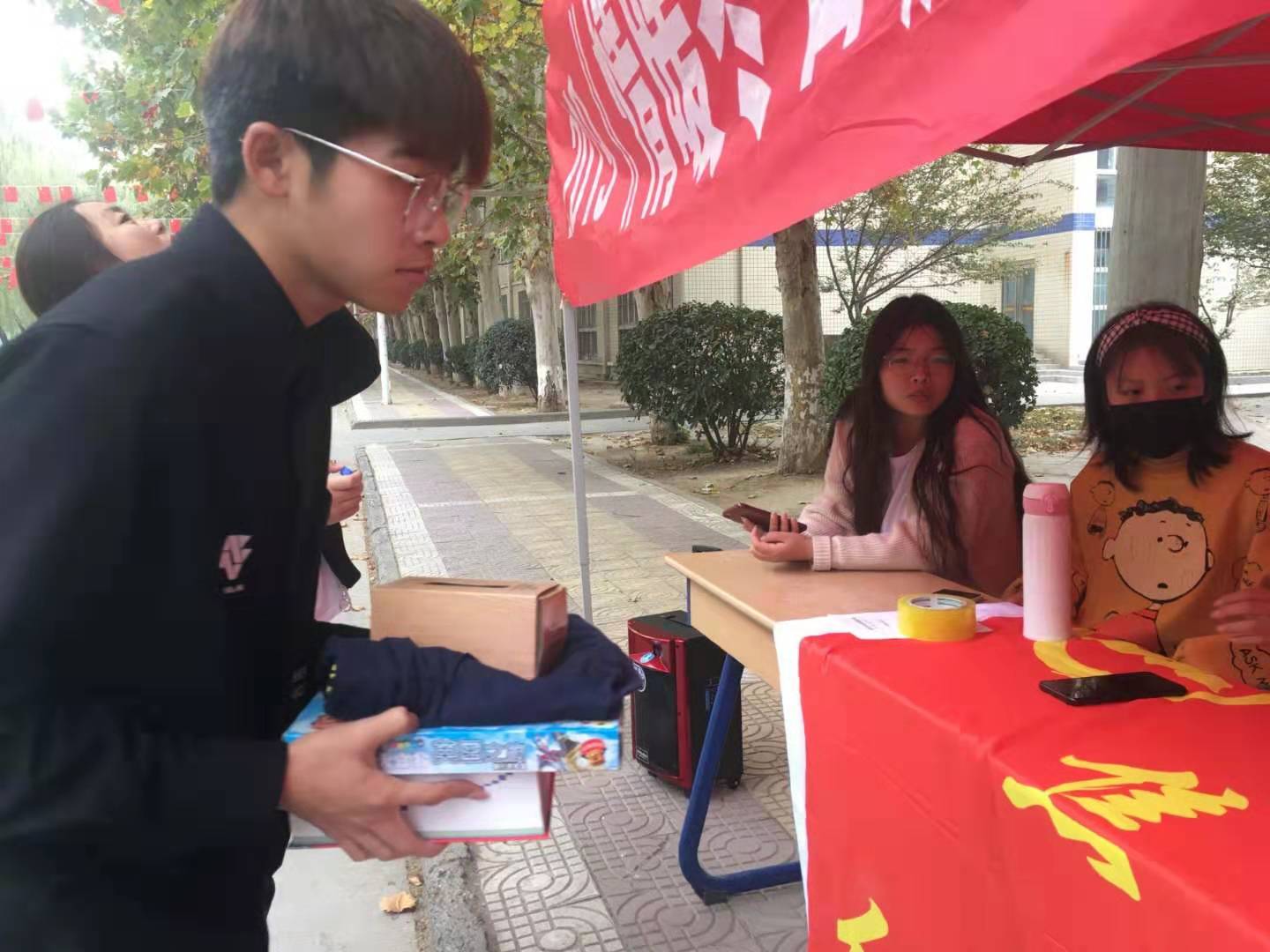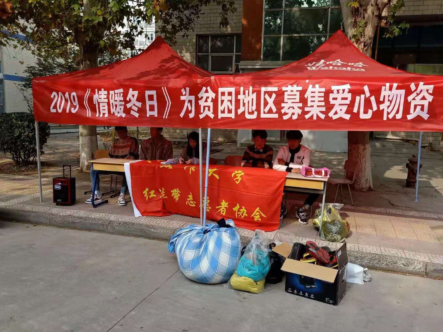 11月9日,2019“情暖冬日”为贫困地区募集爱心物资活动在南校区餐厅南门举行,此次活动由红丝带志愿者协会、微善河南公益组织联合举办,活动得到了我校学生的积极参与。