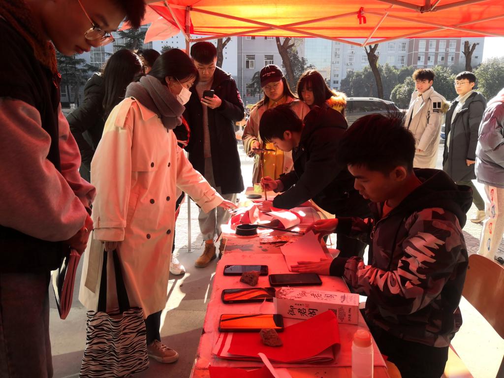 为了弘扬中国传统书法艺术魅力,营造校园新年氛围,我校书法协会于12月25日至27日在南北校区餐厅门口举办“新春对联传温暖,学子执笔送祝福”的送春联活动。