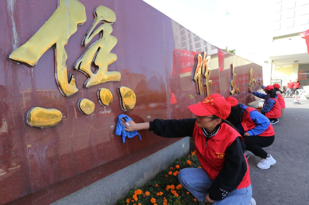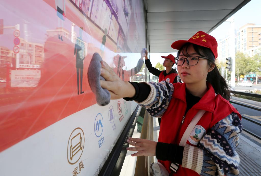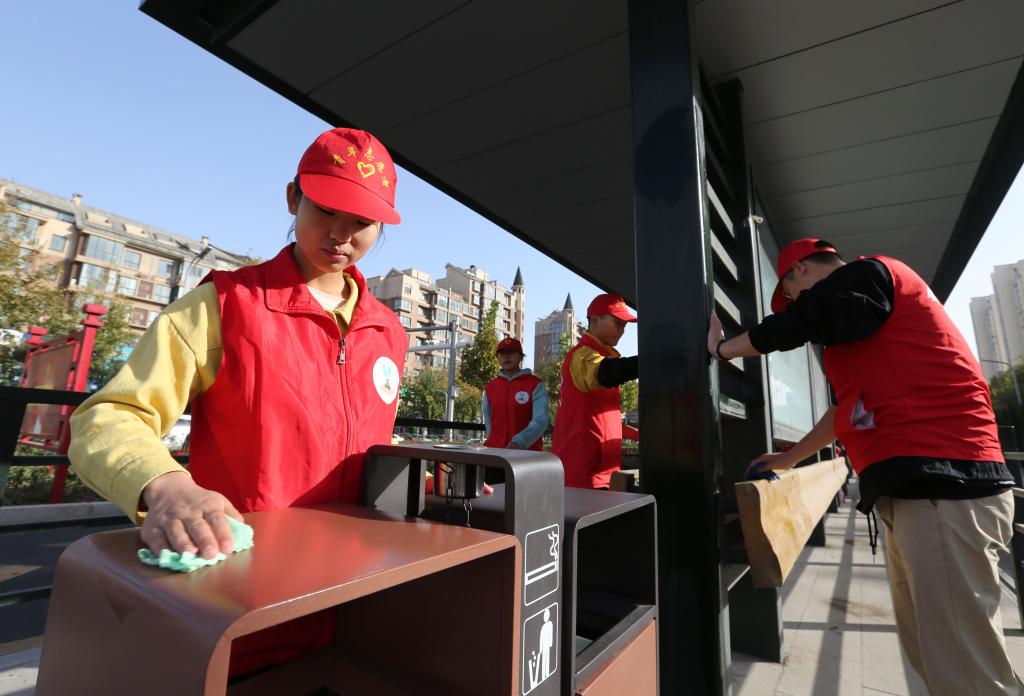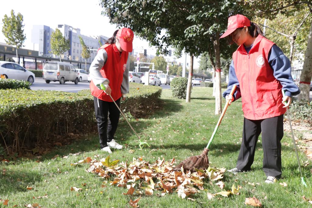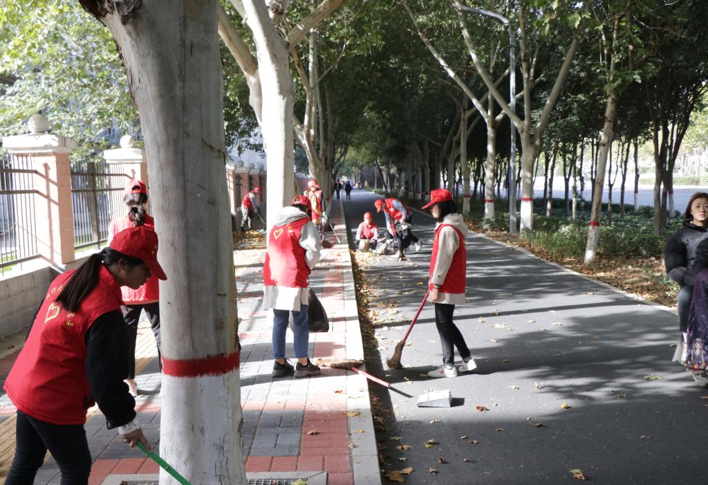 志愿者来到事先分配好卫生区域,大家分工明确,配合默契。活动现场,团旗和志愿者旗迎风飘扬,大家认真擦洗公交站牌橱窗、围栏、座椅,捡起草坪上的塑料垃圾,清扫马路上的树叶,由于风大,刚刚清扫干净的路面又落下树叶,大家又重新打扫。志愿者们发扬不怕苦、不怕累、任劳任怨的奉献精神,很多市民看到我校志愿者的辛勤付出,纷纷表示称赞和肯定。