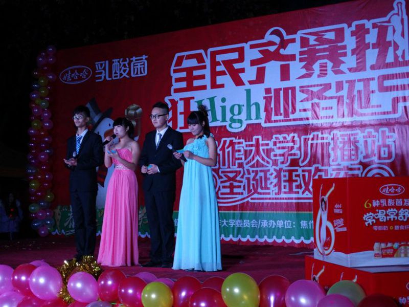 为丰富广大师生的课外生活,12月25日晚,焦作大学广播站在北校区举办了圣诞狂欢夜文艺晚会。校正大食品有限公司宣传部栗岩老师、广播站站长白玉帅、北校区负责人刘珊珊以及500余名同学观看了晚会。