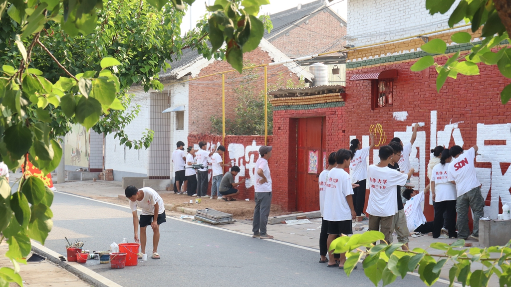 7月2日,21名师生组成的实践团抵达南临泉村。团队在前期已完成近1200平方米墙绘的基础上,精心选取适宜墙面进行补充与提升,新增绘制约600平方米。创作聚焦“党建引领”与“乡村振兴”核心主题,深入挖掘当地历史文脉、贤孝文化、农耕传统等特色元素,创作出一系列生动展现新时代乡风文明与乡村新貌的精美墙绘作品,持续为“乡村振兴青春建功行动”注入艺术动能。