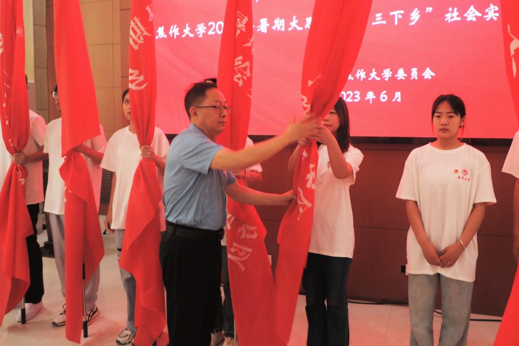 启动仪式上,校党委副书记靳贤胜宣布《焦作大学2023年暑期“三下乡”社会实践活动立项名单》,校党委书记汪诗怀为我校立项实践团队进行了授旗。