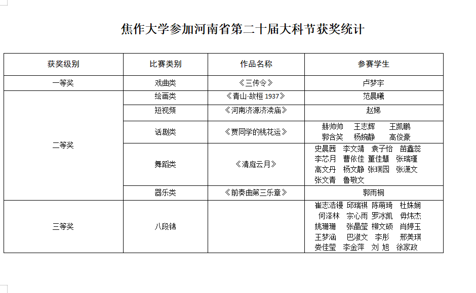 近日,由中共河南省委宣传部、河南省教育厅、共青团河南省委、河南省科学技术厅、河南省学生联合会共同举办的河南省第二十届大学生科学文化艺术节评选结果正式公布。我校在本届大学生科学文化艺术节中表现优异,共荣获7个奖项,包括一等奖1项、二等奖5项、三等奖1项。