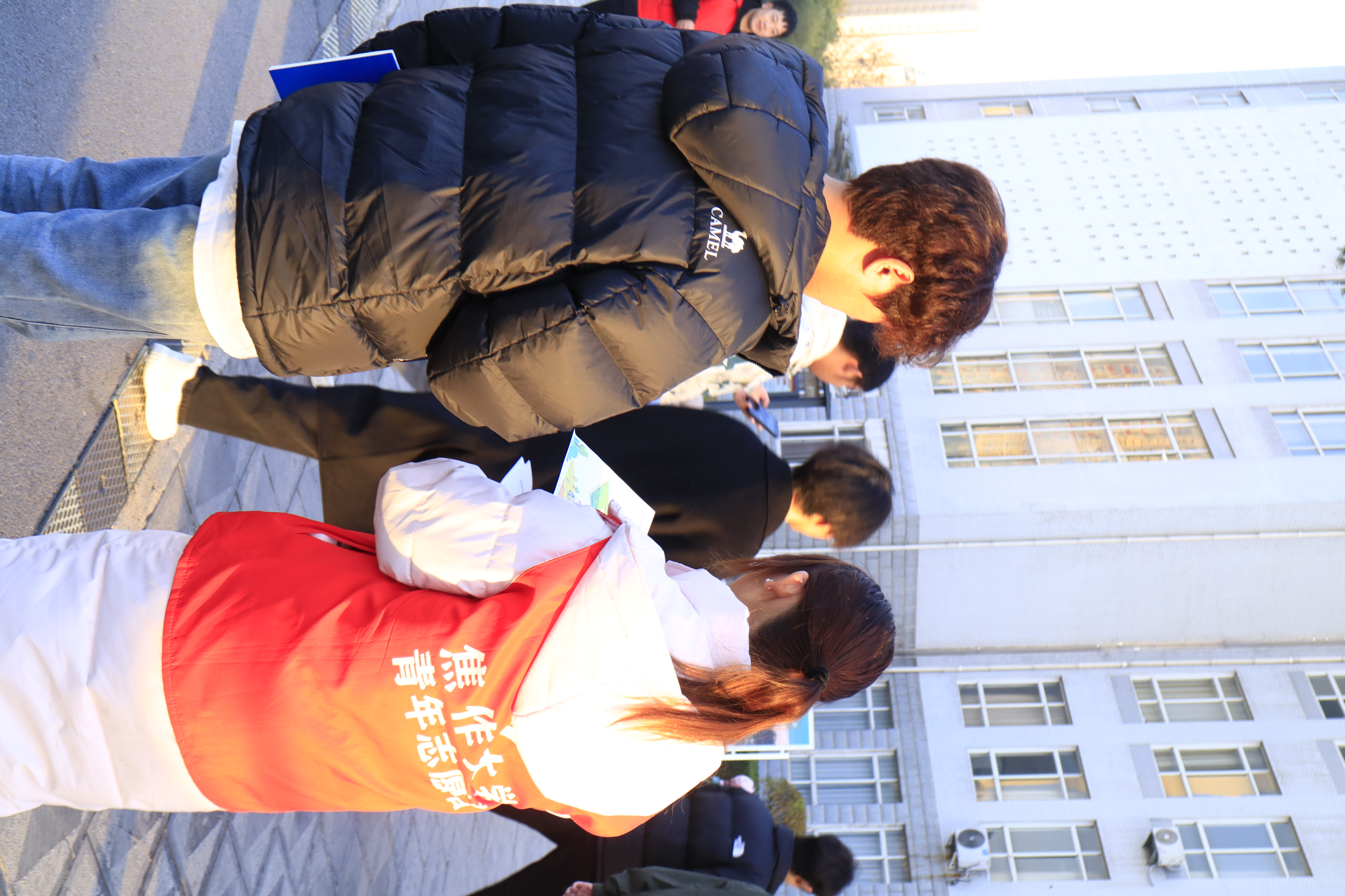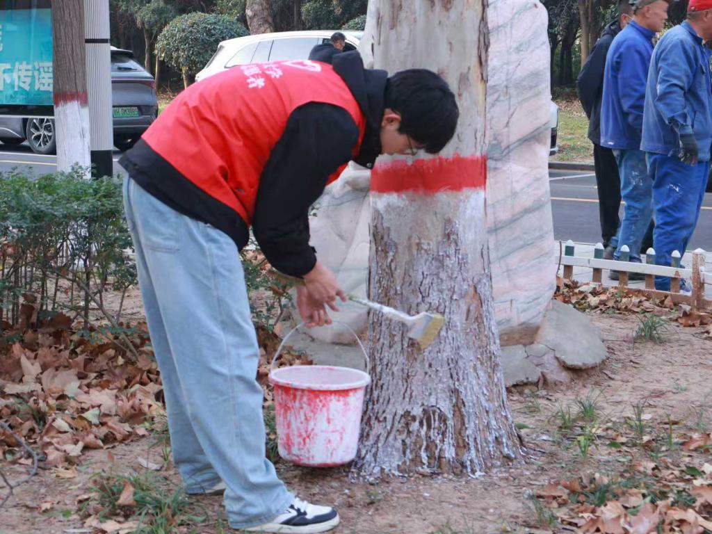 在绿植维护区,“领养驿站”前排起蜿蜒长队。同学们领取盆栽时签署《养护承诺书》,郑重写下校园生态责任誓约。在后勤基建处专业维护人员的指导下,志愿者们仔细地为校园里那些需要特别呵护的树木主干穿上特质白色“保暖衣”——这层由环保石灰和药剂混合而成的涂料,能有效反射阳光、防止冻裂、杀灭越冬害虫。志愿者们承诺会持续管护校园绿植,为建设绿色校园贡献青春力量。